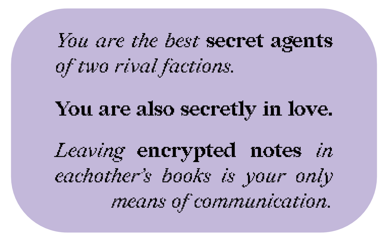 Hide and Read is a letter-writing game for two players: each player takes on the role of one of the two secret agents and together they'll tell their love story through the hidden notes they leave in eachother's books.