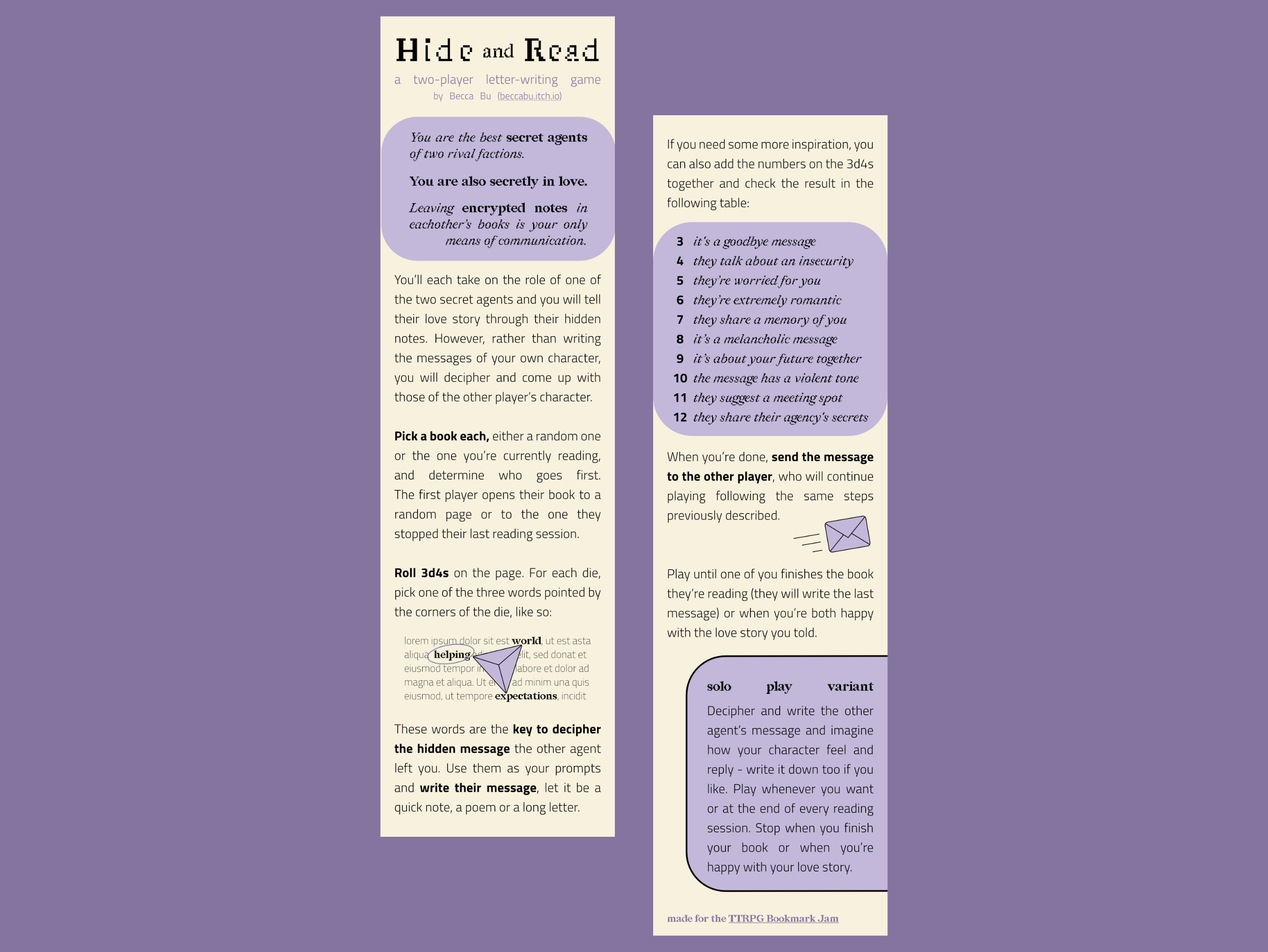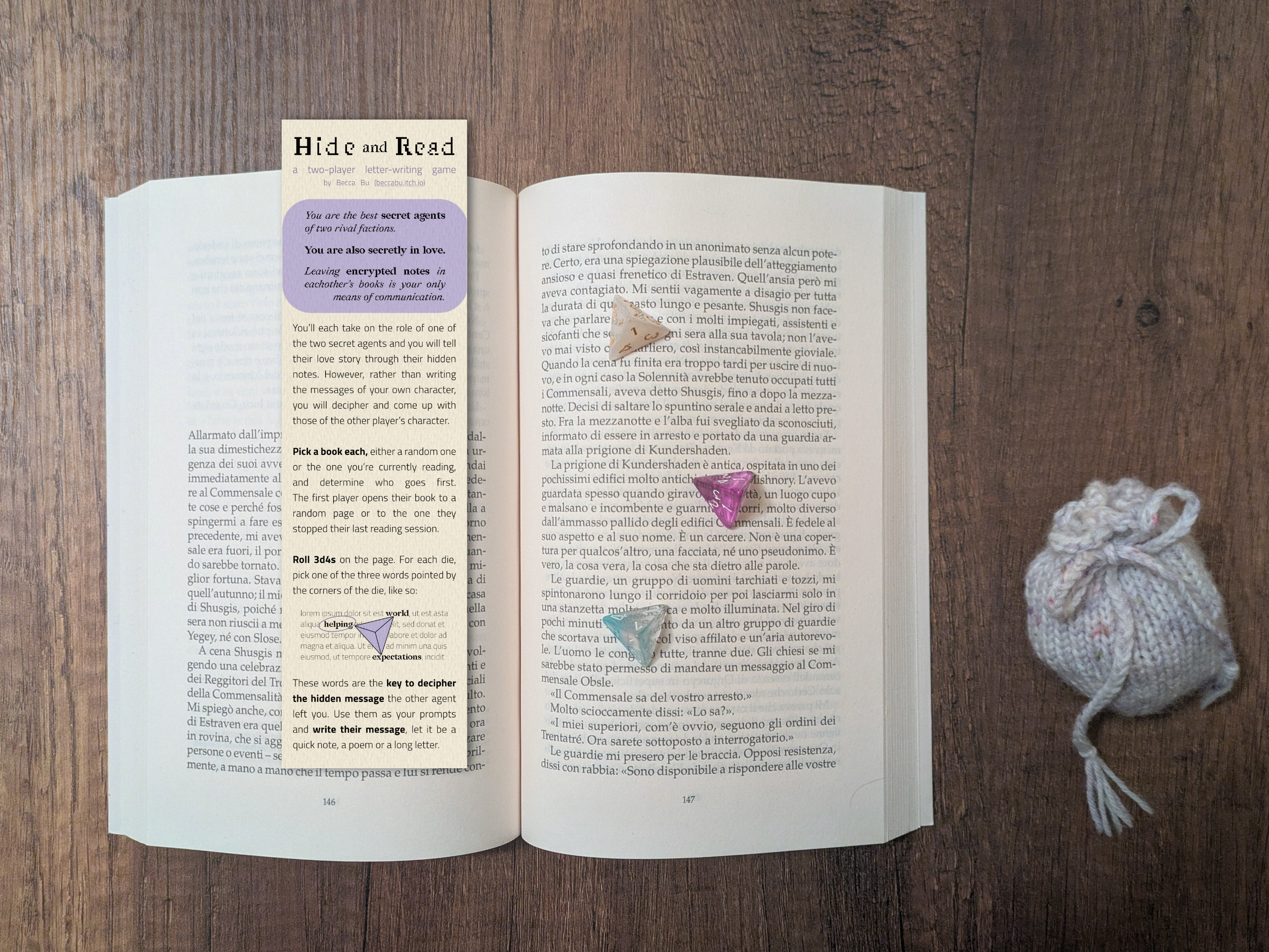 Hide and Read was made for the TTRPG Bookmark Jam and it's inspired by the incredible book This Is How You Lose the Time War by Amal El-Mohtar and Max Gladstone.